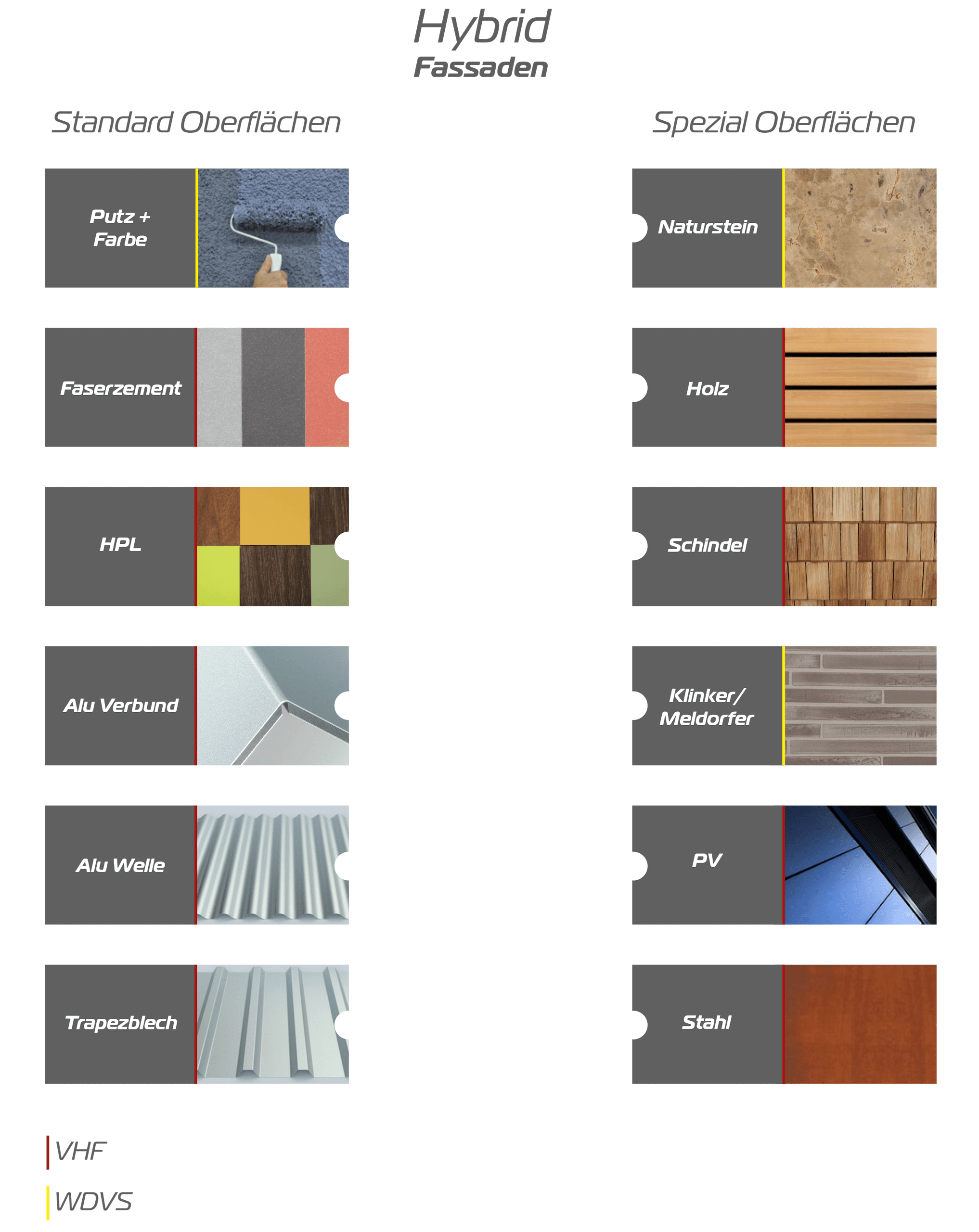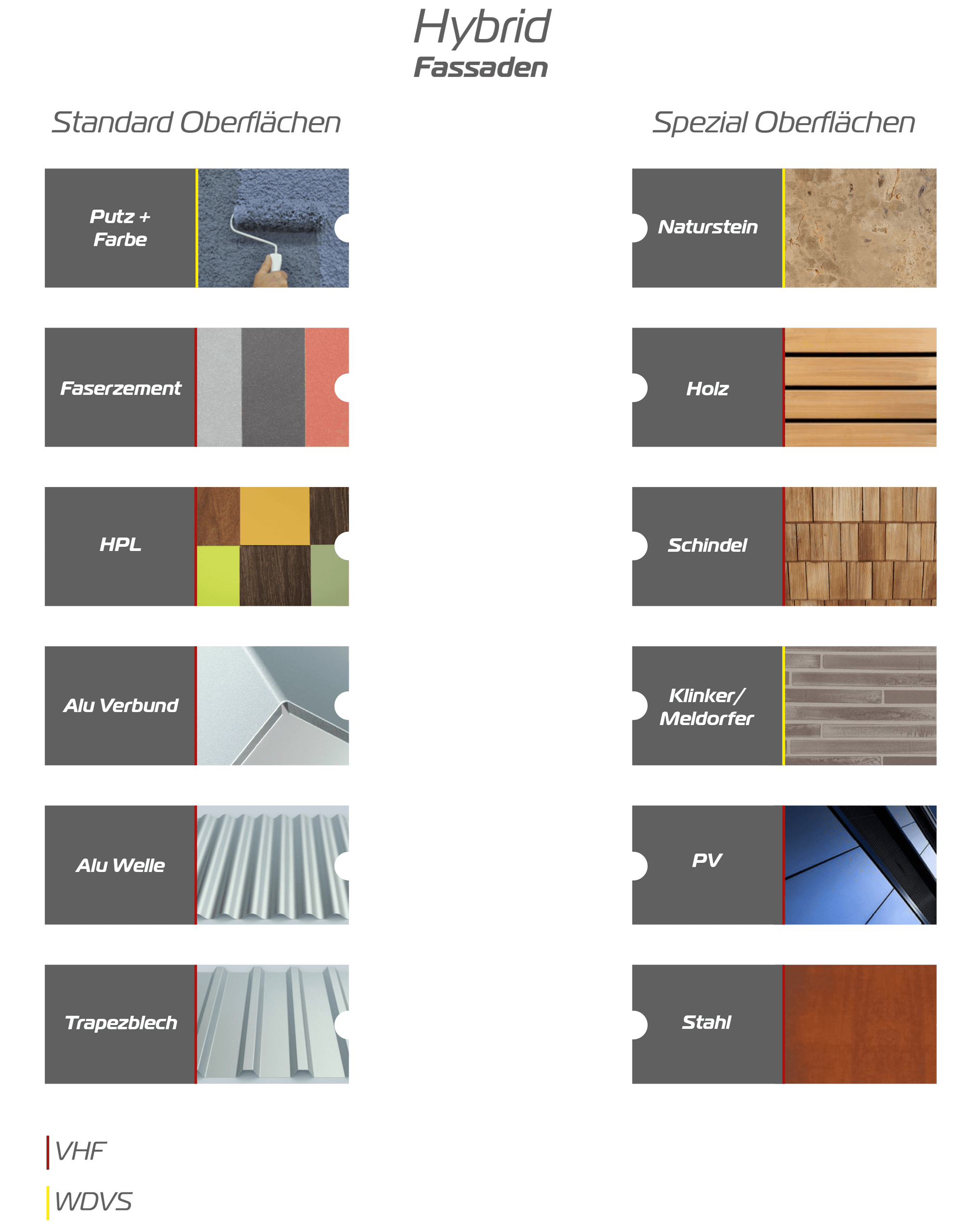 Hier sind einer individuellen, architektonischen Fassadengestaltung keine Grenzen gesetzt. Es bestehen unendlich viele Möglichkeiten und Kombinationen zwischen einer WDVS-Fassade und einer VHF-Fassade. Man kann natürlich auch mit unterschiedlichen Materialien einem spannenden und interessanten Materialmix herstellen. Hier können Sie die sichtbare Visitenkarte Ihrer Immobilie individuell gestalten. Anbei eine Übersicht der vielfältigen Möglichkeiten einer Fassadengestaltung.